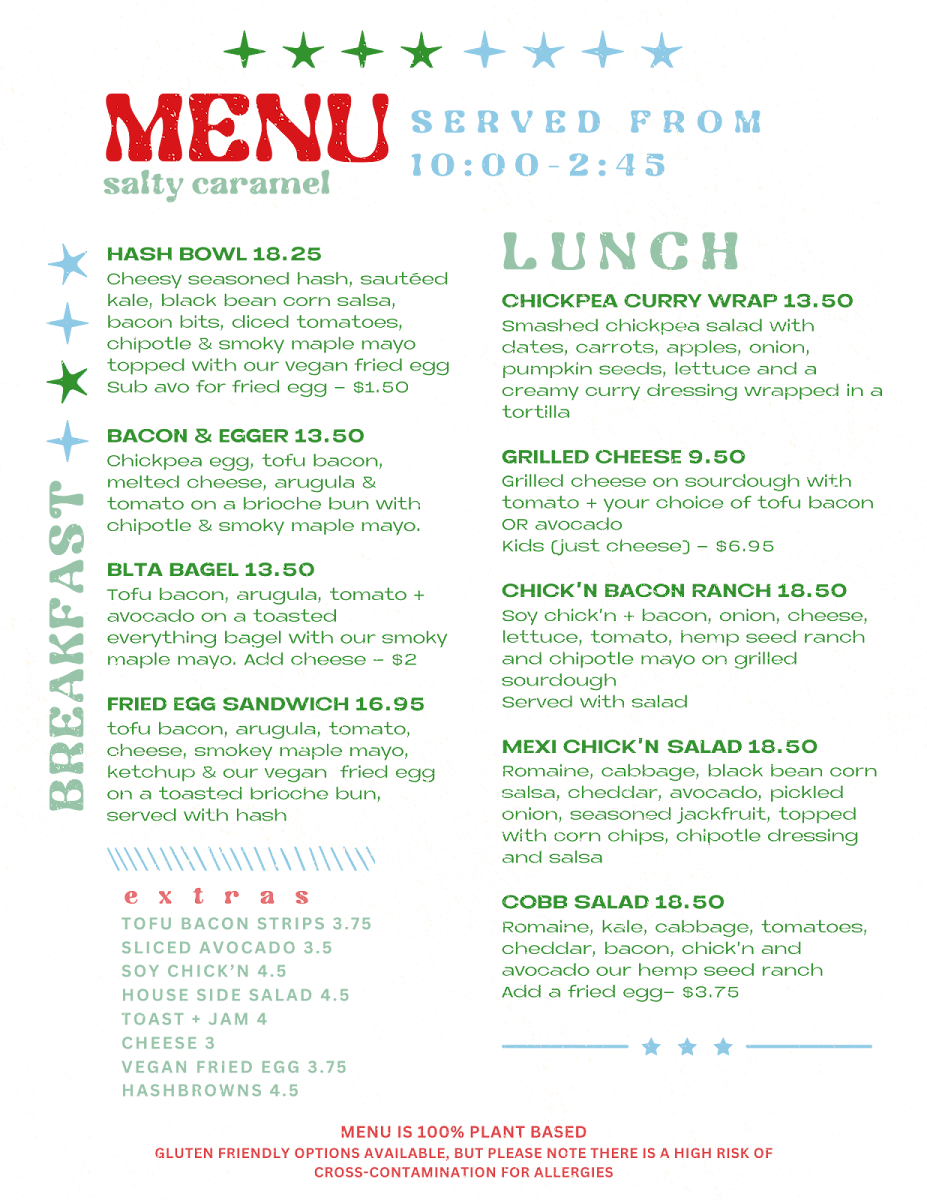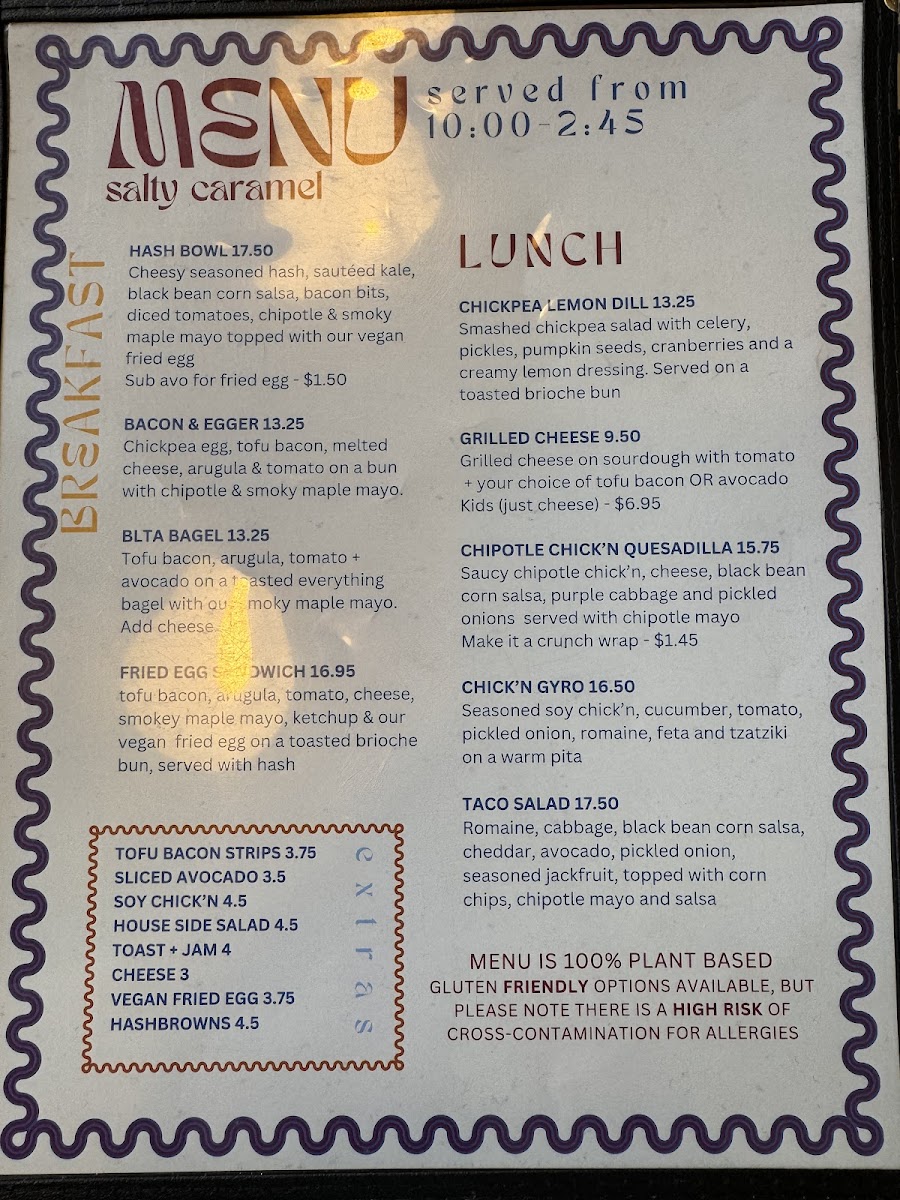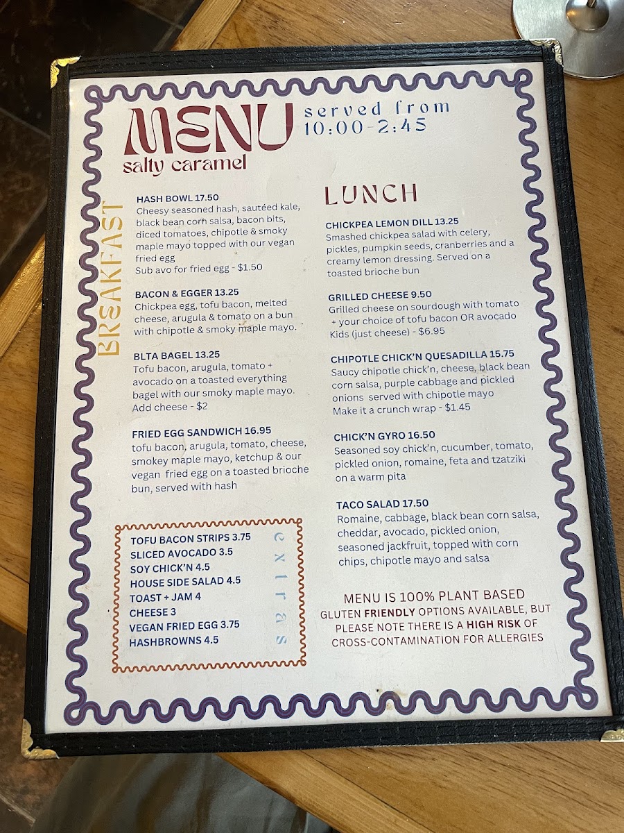 The Salty Caramel Kitchen, located at 11407 Okanagan Centre Rd W, Lake Country, BC, offers a diverse and flavorful menu that caters to a wide range of tastes, making it a perfect spot for both casual breakfasts and lunches. For breakfast, you can enjoy their hearty Hash Bowl, Bacon & Egger, or a classic Fried Egg Sandwich, offering a satisfying start to your day. For lunch, the menu includes comfort food like the gooey Grilled Cheese, a refreshing Mexi Chick N Salad, and a variety of tasty extras such as Tofu Bacon Strips and Sliced Avocado.