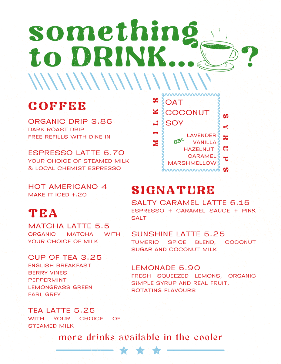 To pair with these meals, The Salty Caramel Kitchen offers a variety of beverages, including caffeinated drinks like the Organic Dri, Americano, and creamy LatteTea. For those looking for something refreshing, their Matcha Latte and Signature Sunshine Latte stand out. The café also has a tempting selection of Holiday Drinks, such as Terry's Chocolate, Candy Candy Matcha, and Peppermint Mocha, perfect for celebrating the season.